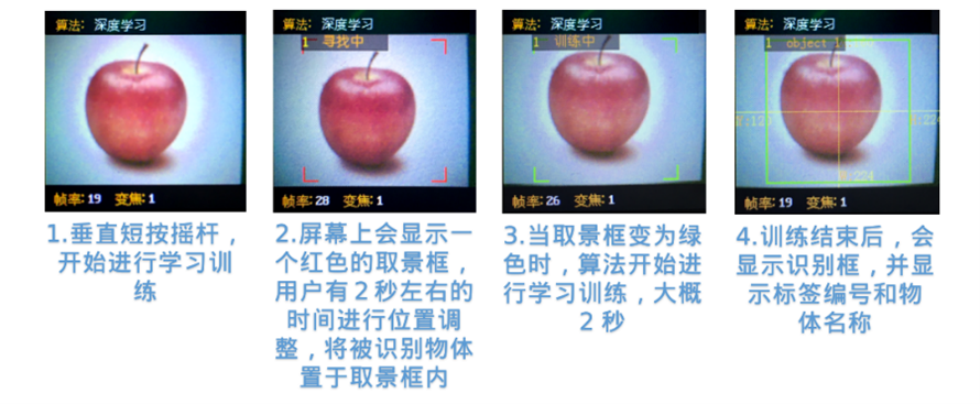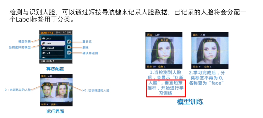 | 7 | 人脸识别 | 检测与识别人脸,可以通过短按导航键来记录人脸数据,已记录的人脸将会分配一个Label标签用于分类 |